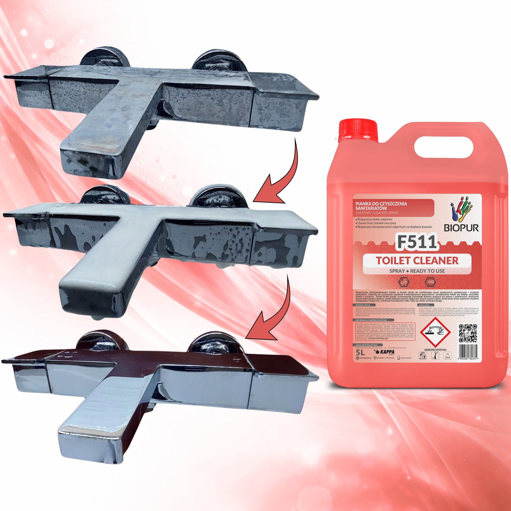 BIOPUR F511 w wersji 5L to kwaśny preparat czyszczący o pH w zakresie 0–2, przeznaczony do usuwania trudnych zabrudzeń nieorganicznych.