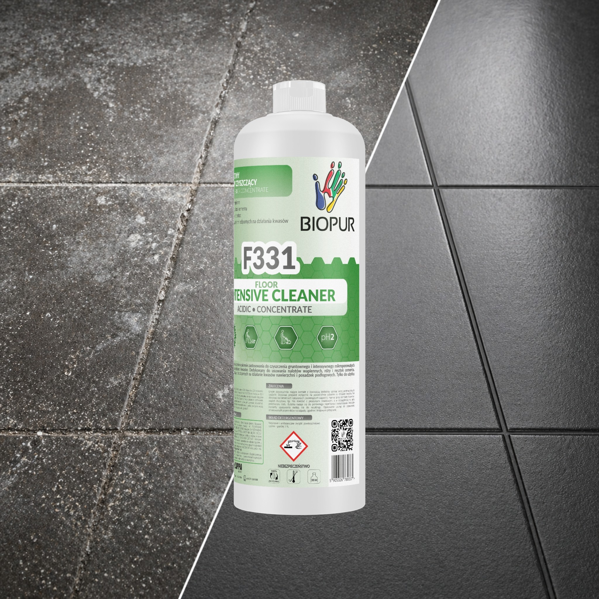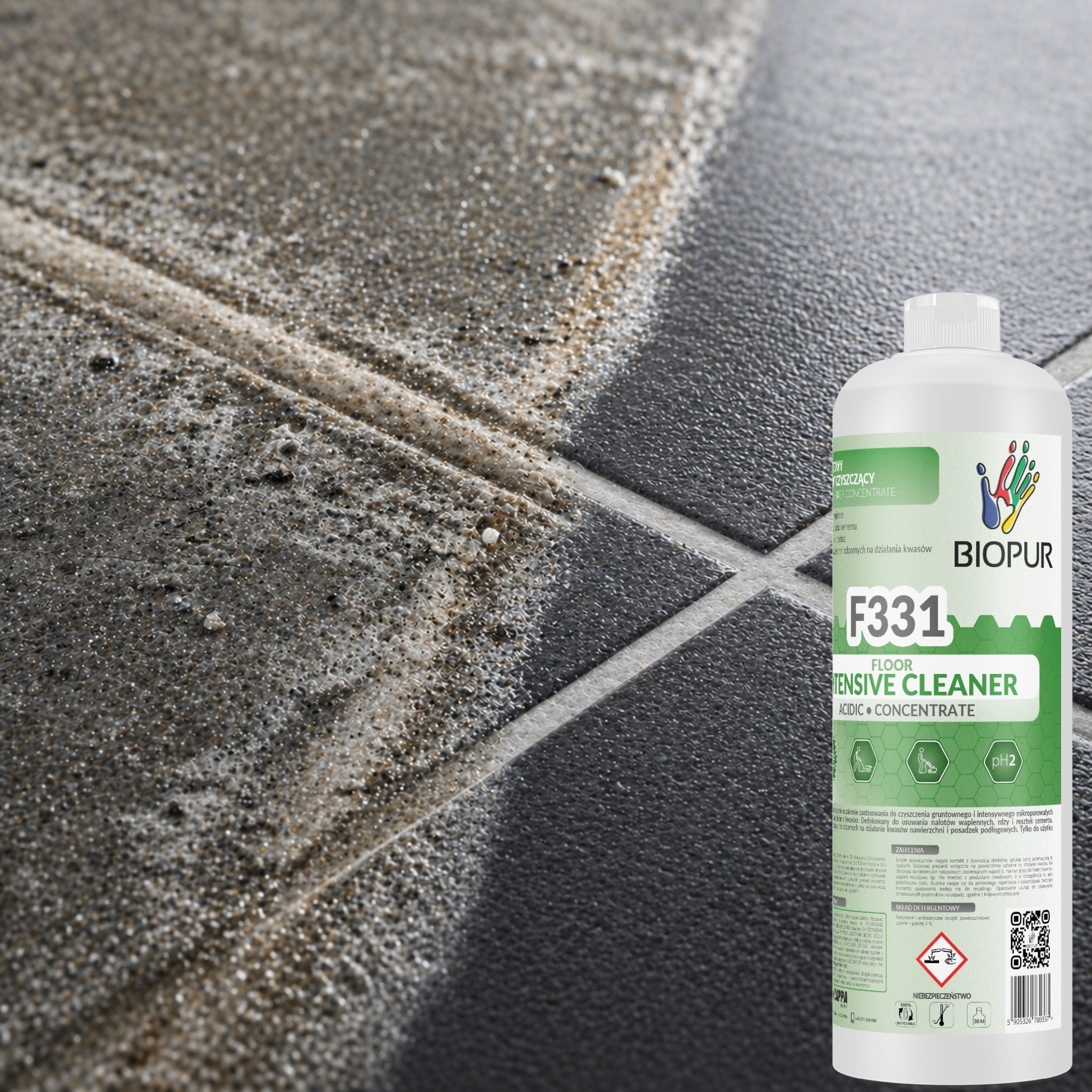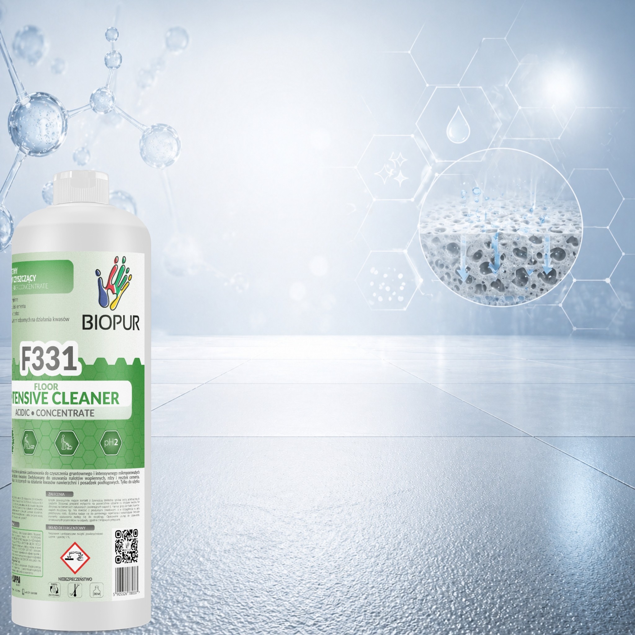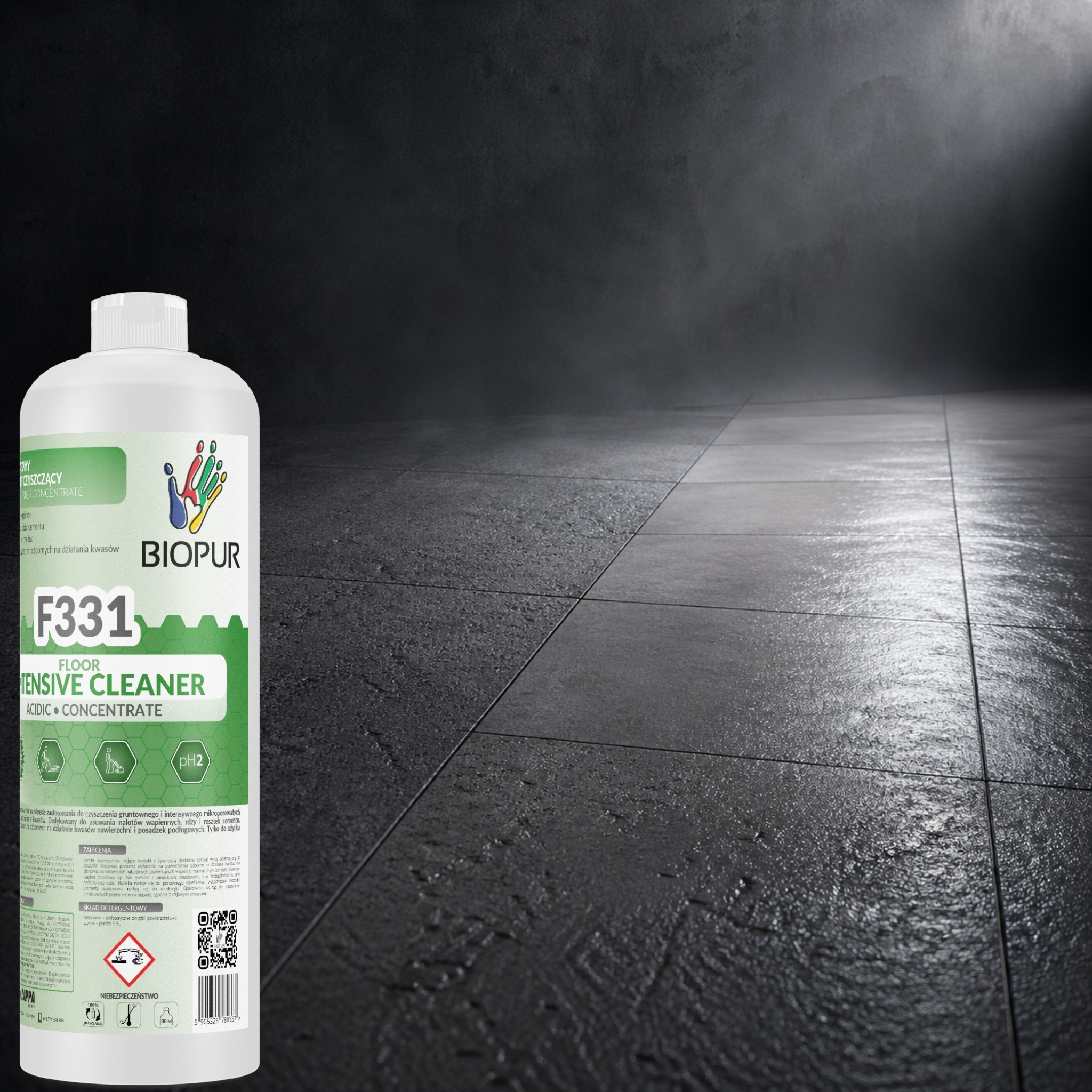 Biopur F331 1L to profesjonalny kwasowy koncentrat do gruntownego czyszczenia podłóg ceramicznych i powierzchni kwasoodpornych, który skutecznie usuwa kamień, rdzę oraz osady mineralne i cementowe.