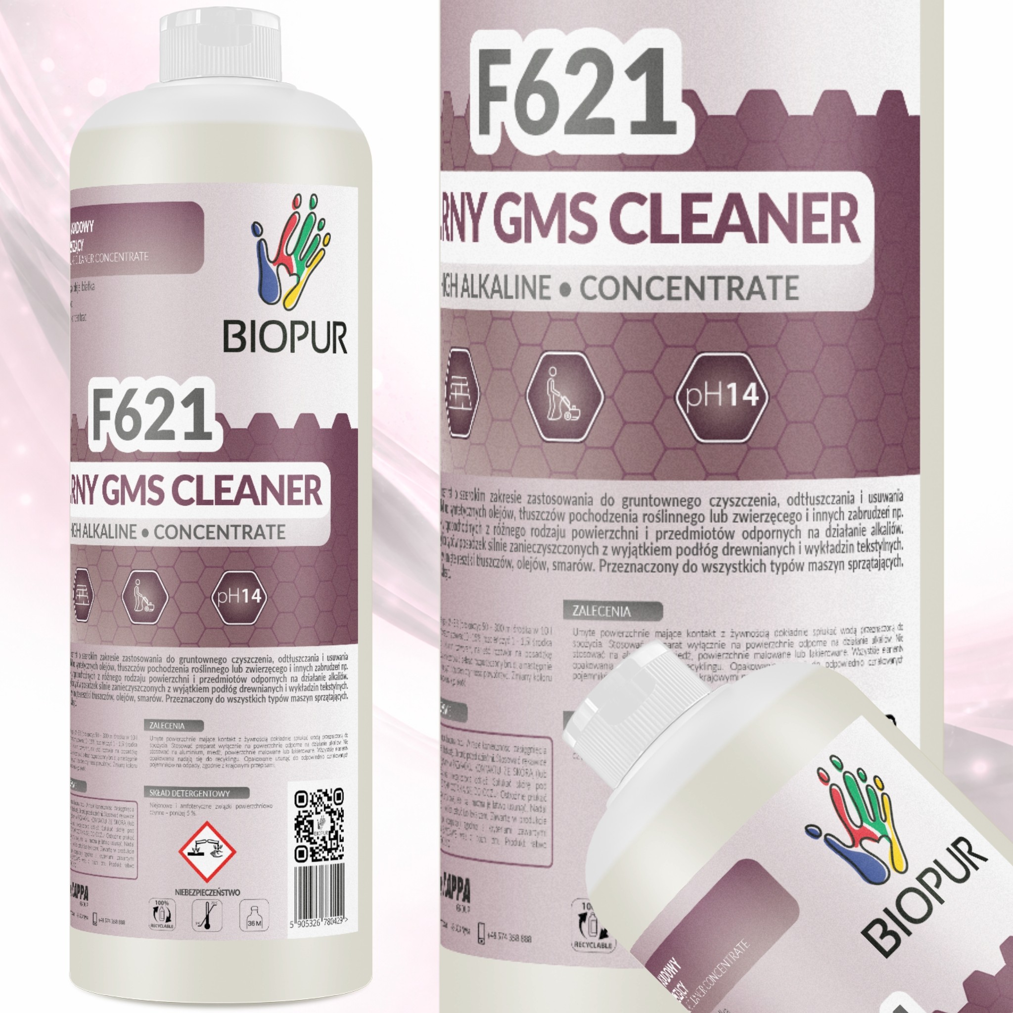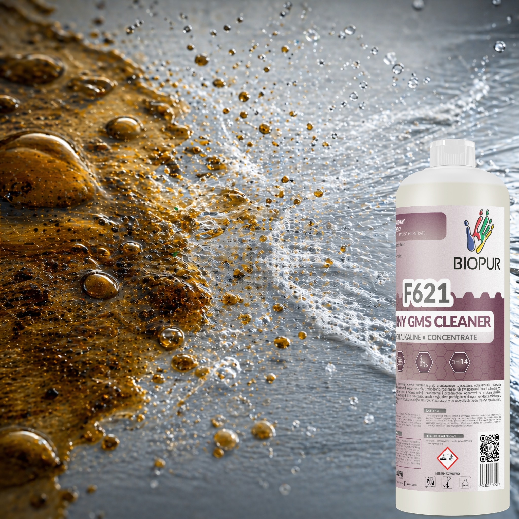 Biopur F621 1L Burny GMS CLEANER to wodny koncentrat o bardzo wysokim odczynie zasadowym (pH 11,5–14), który skutecznie rozbija struktury tłuszczów i zabrudzeń organicznych.