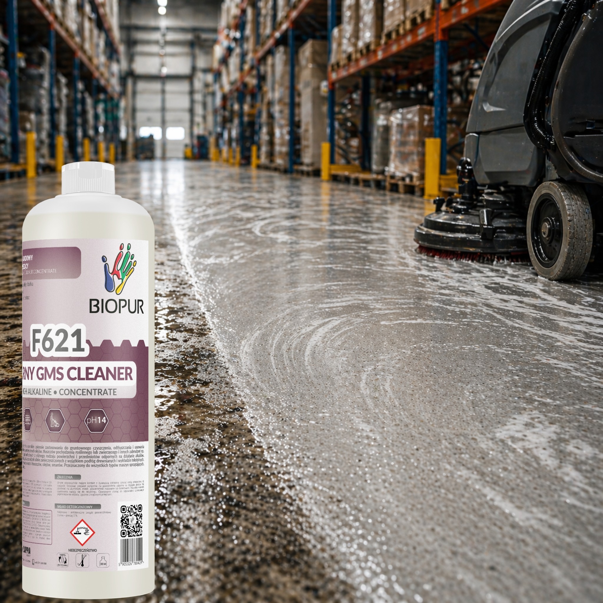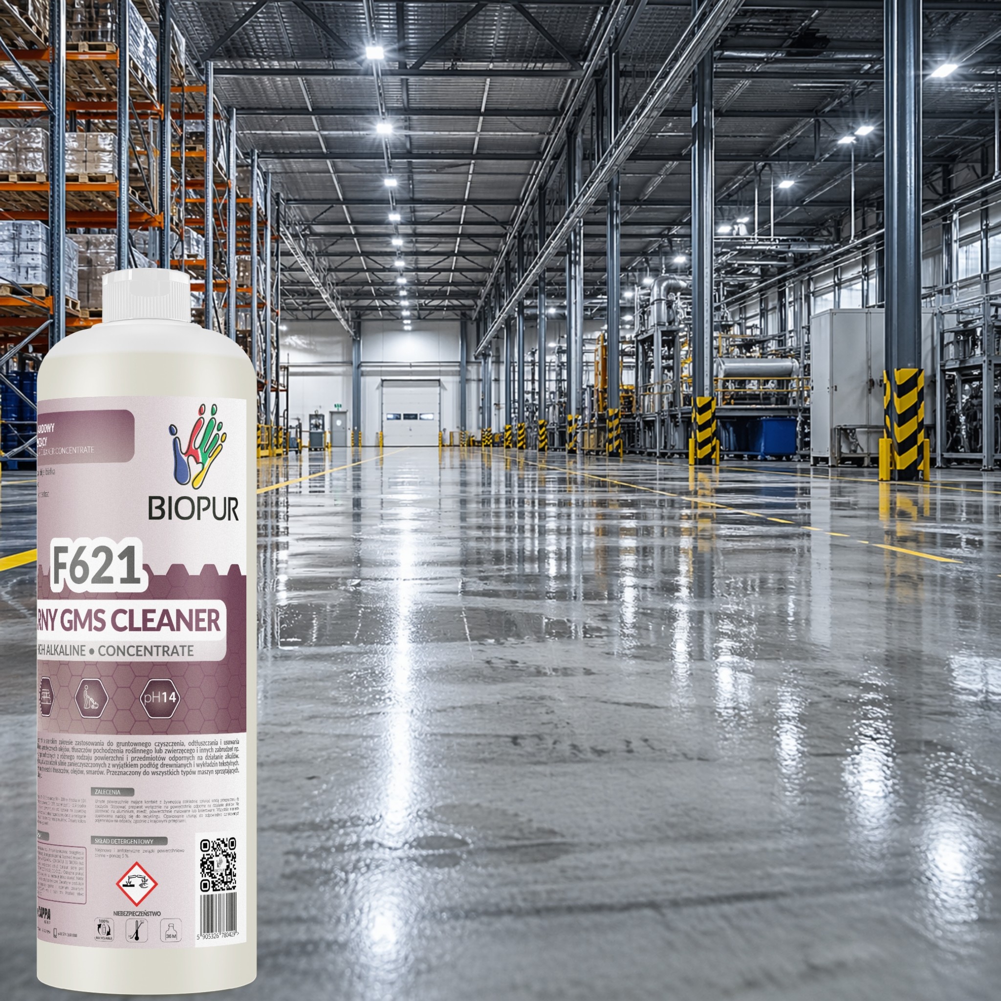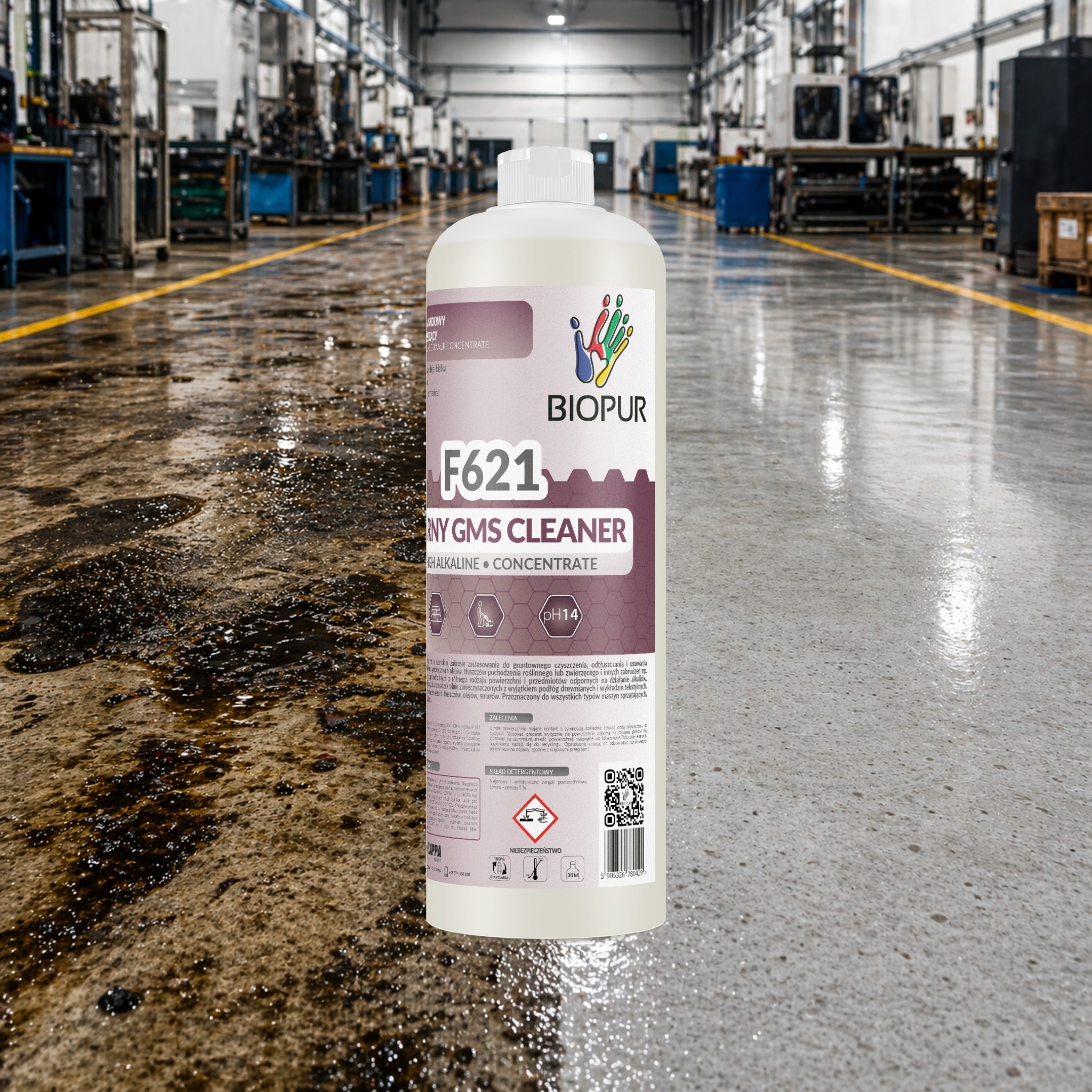 Biopur F621 1L Burny GMS CLEANER to silny odtłuszczacz przemysłowy i koncentrat do czyszczenia posadzek, stworzony do skutecznego usuwania oleju, smaru oraz uporczywych zabrudzeń technologicznych.