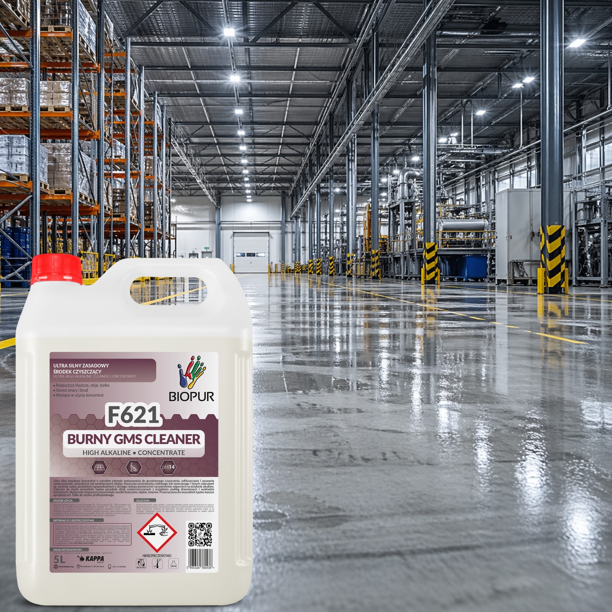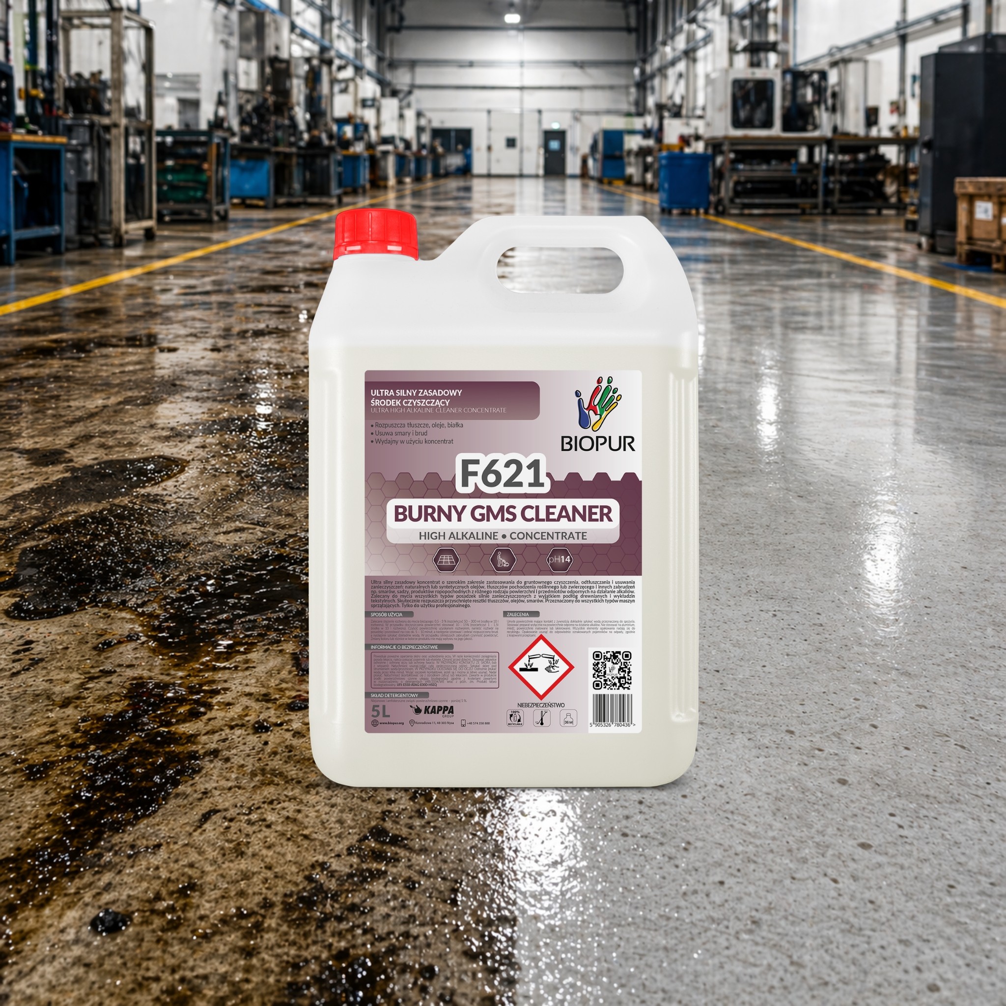 Biopur F621 5L Burny GMS CLEANER to wydajny koncentrat do mycia posadzek i silny środek do odtłuszczania powierzchni przemysłowych, przeznaczony do usuwania tłuszczu, oleju oraz trudnych zabrudzeń eksploatacyjnych.