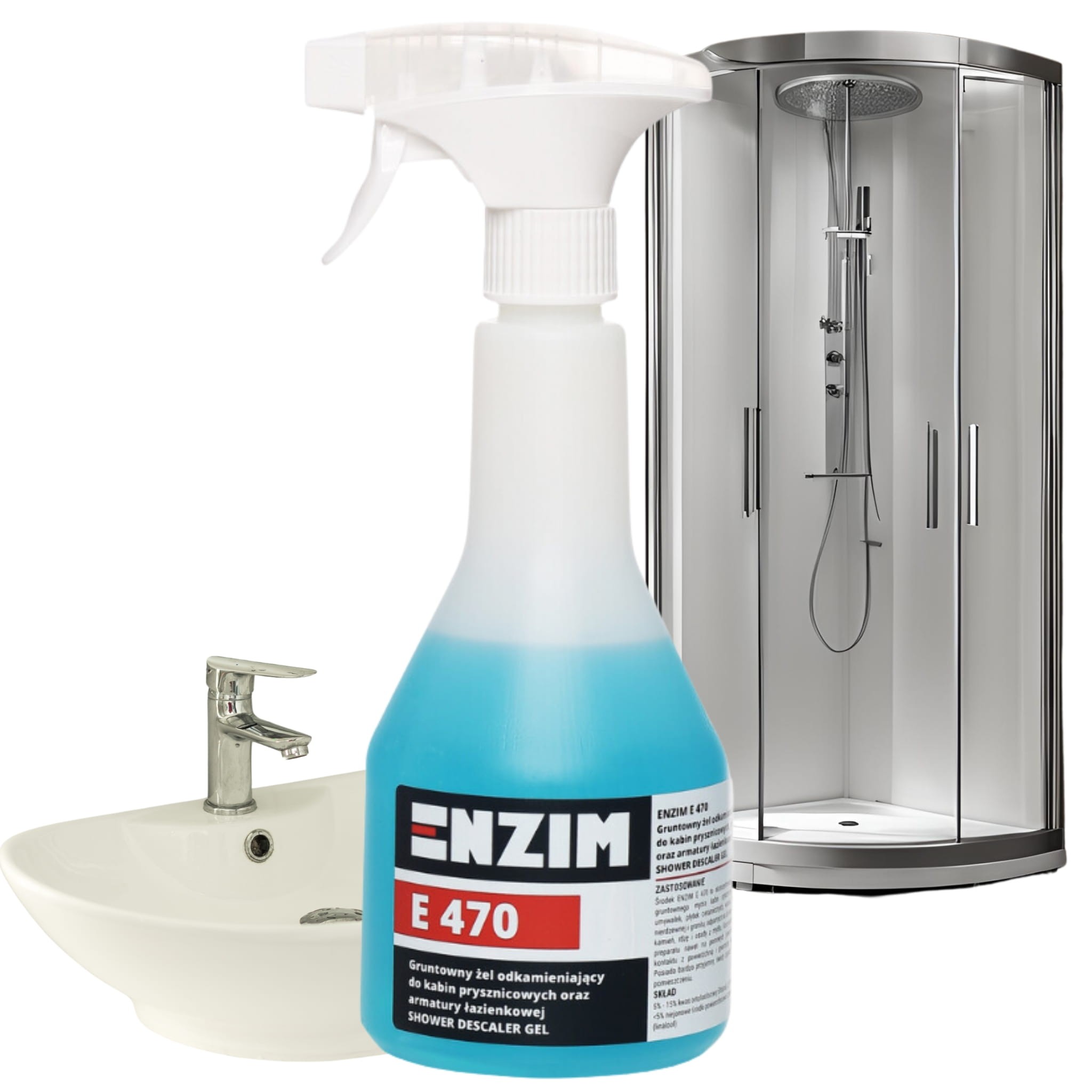 Enzim E 470 DESCALER GEL to profesjonalny żel czyszczący do łazienki, stworzony do skutecznego usuwania kamienia, rdzy, osadów z mydła i zabrudzeń mineralnych.