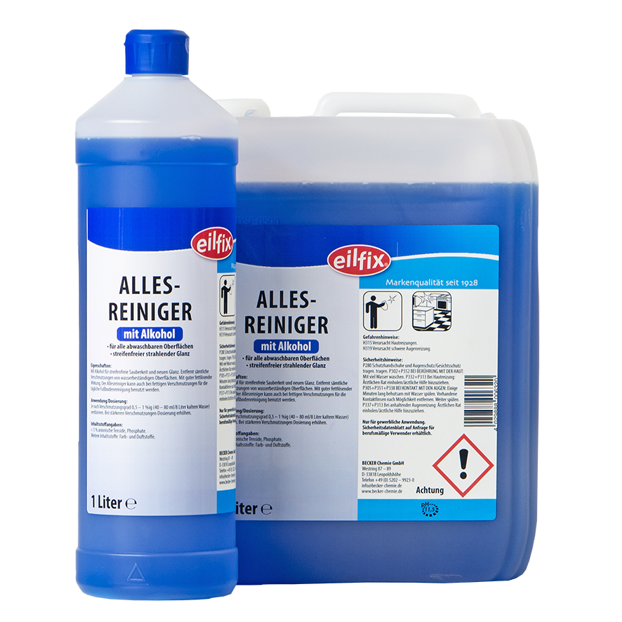 Eilfix ALLESREINIGER MIT ALKOHOL 1L to wydajny, alkoholowy preparat czyszczący o świeżym cytrynowym zapachu, przeznaczony do codziennego użytku w utrzymaniu czystości w kuchniach, biurach i pomieszczeniach użytkowych.