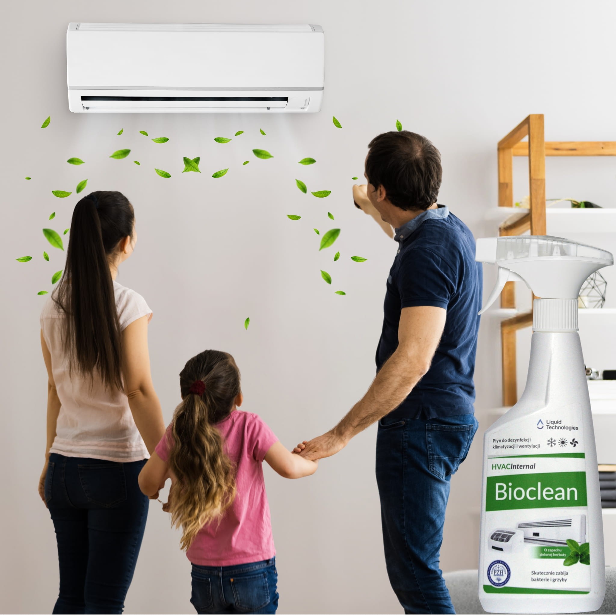 HVAC Internal Bioclean 500 ml to gotowy do użycia preparat do skutecznej dezynfekcji parowników, tac skroplinowych oraz filtrów powietrza w jednostkach wewnętrznych systemów klimatyzacyjnych i wentylacyjnych. Dzięki delikatnemu zapachowi zielonej herbaty, nie tylko neutralizuje przykre wonie, ale również pozostawia w pomieszczeniu przyjemną świeżość.