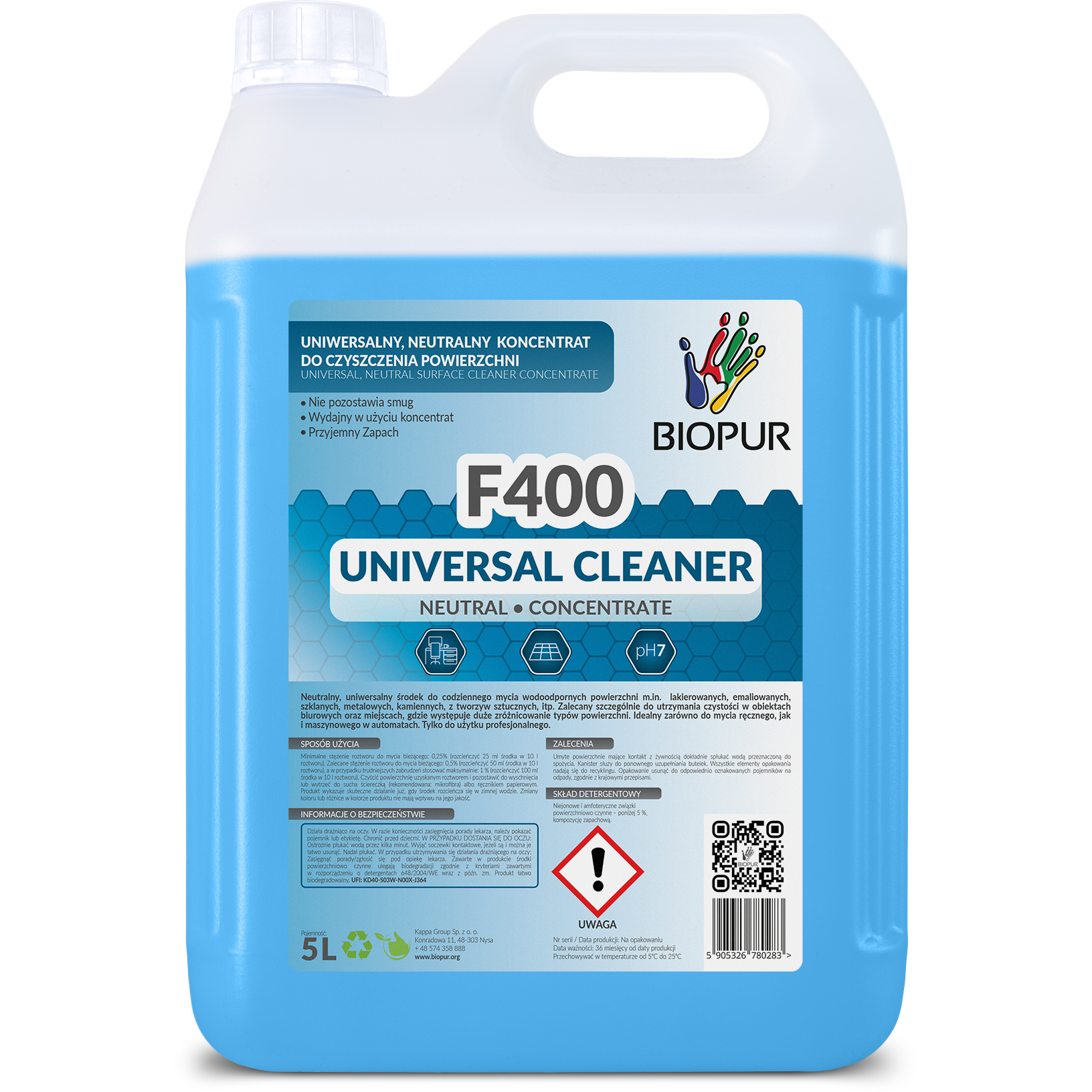 Biopur F400 to uniwersalny środek czyszczący, który sprawdzi się zarówno w biurze, domu, sklepie, jak i innych przestrzeniach. Jest przeznaczony do mycia podłóg oraz powierzchni ponadpodłogowych, takich jak: